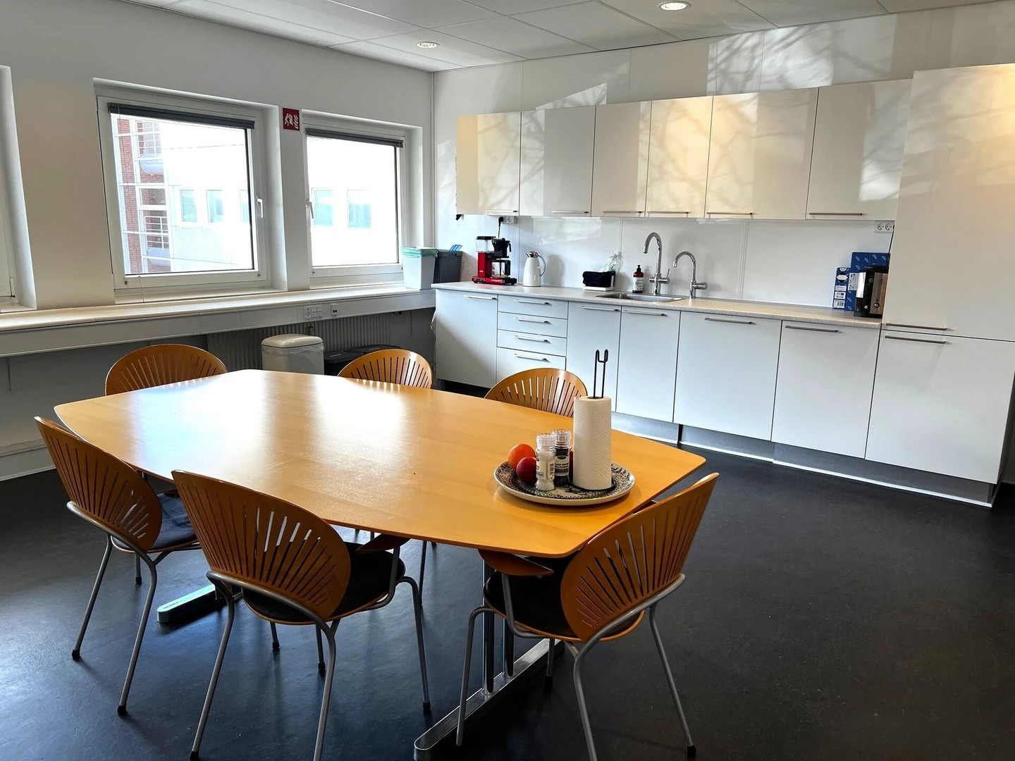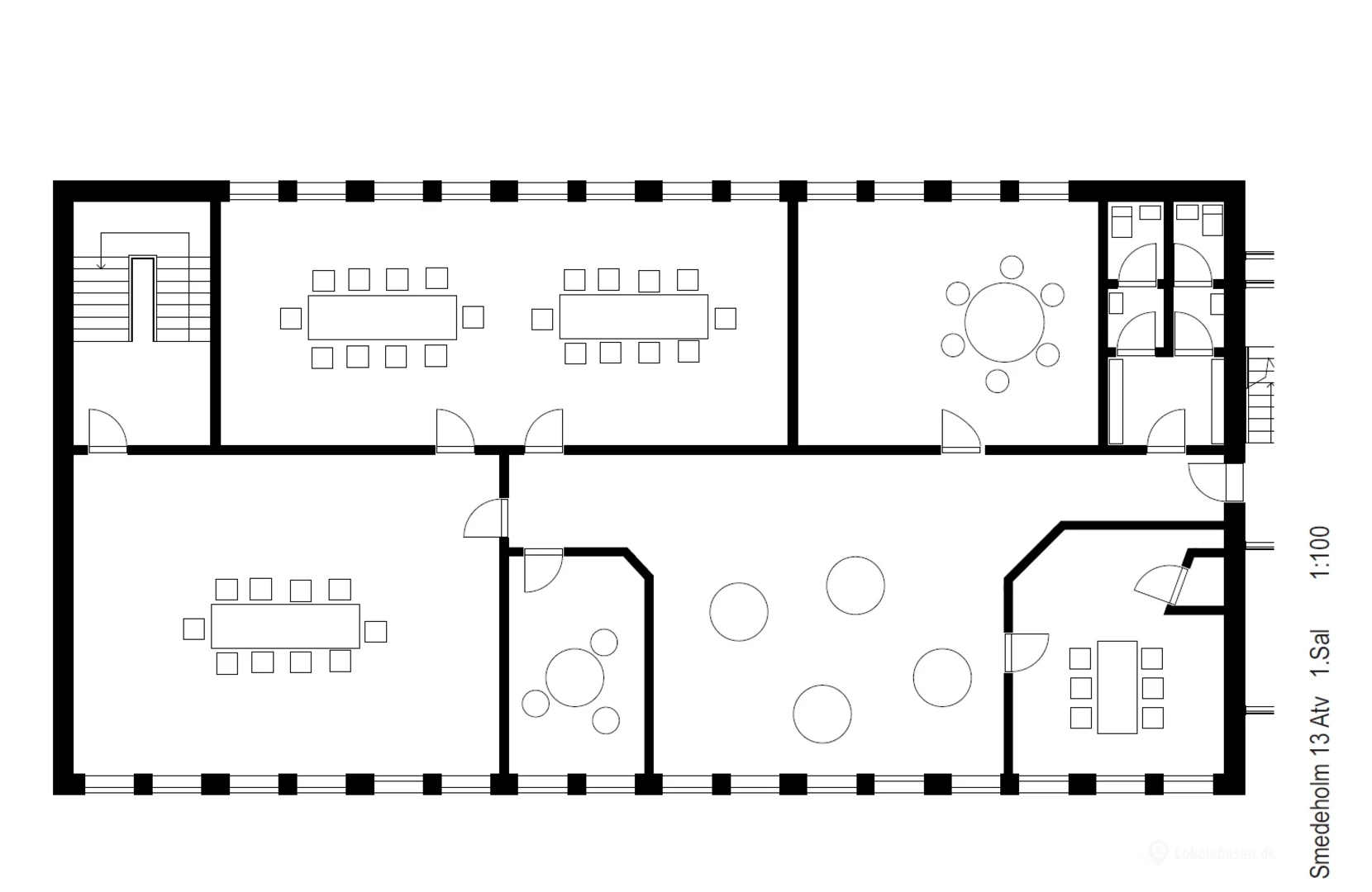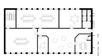 Indretningen byder på både åbne kontorområder, separate kontorer samt møde- og opholdsrum. Derudover er der adgang til køkken- og spisefaciliteter, hvilket gør lejemålet ideelt til virksomheder med behov for både arbejdsplads og fællesområder.